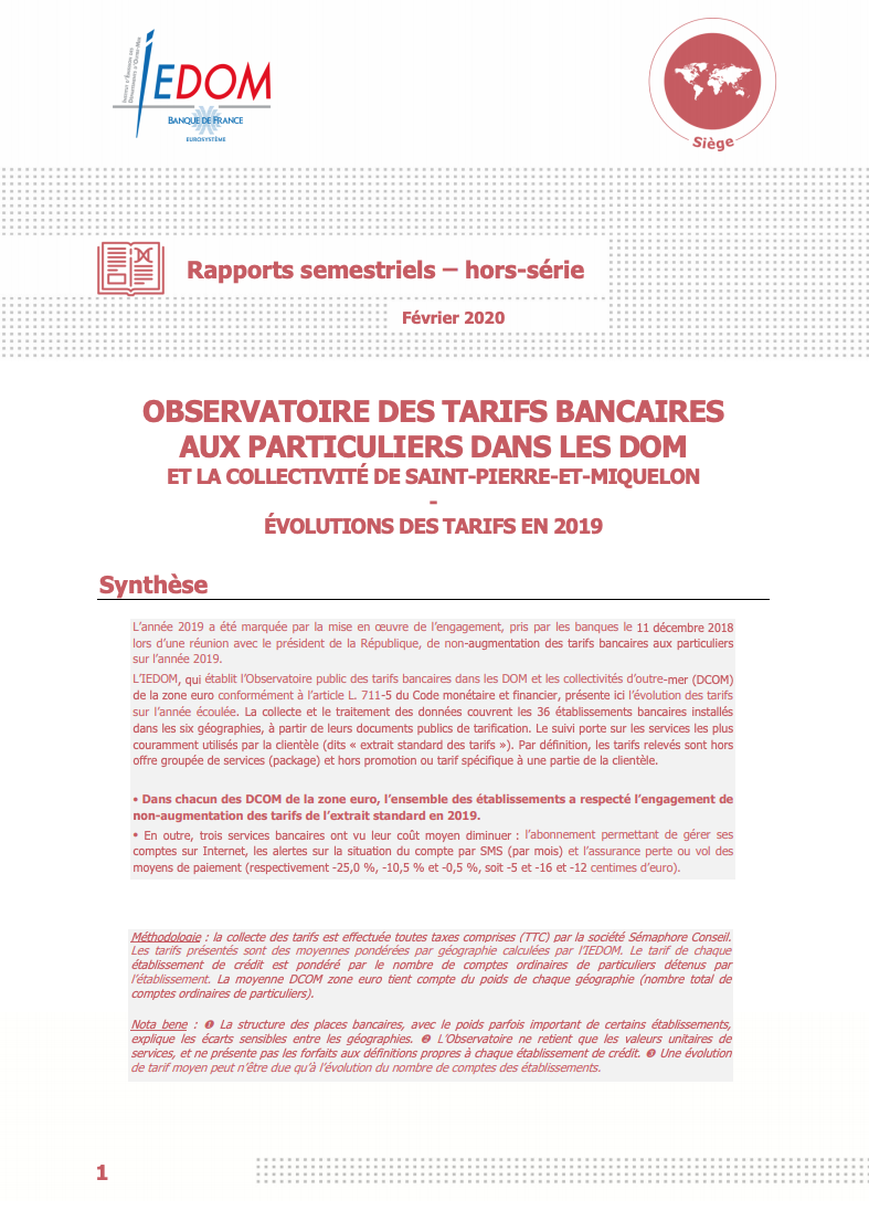L’IEDOM, qui établit l’Observatoire public des tarifs bancaires dans les DOM et les collectivités d’outre-mer (DCOM) de la zone euro conformément à l’article L. 711-5 du Code monétaire et financier, présente ici l’évolution des tarifs sur l’année écoulée. La collecte et le traitement des données couvrent les 36 établissements bancaires installés dans les six géographies, à partir de leurs documents publics de tarification. Le suivi porte sur les services les plus couramment utilisés par la clientèle (dits « extrait standard des tarifs »). Par définition, les tarifs relevés sont hors offre groupée de services (package) et hors promotion ou tarif spécifique à une partie de la clientèle.