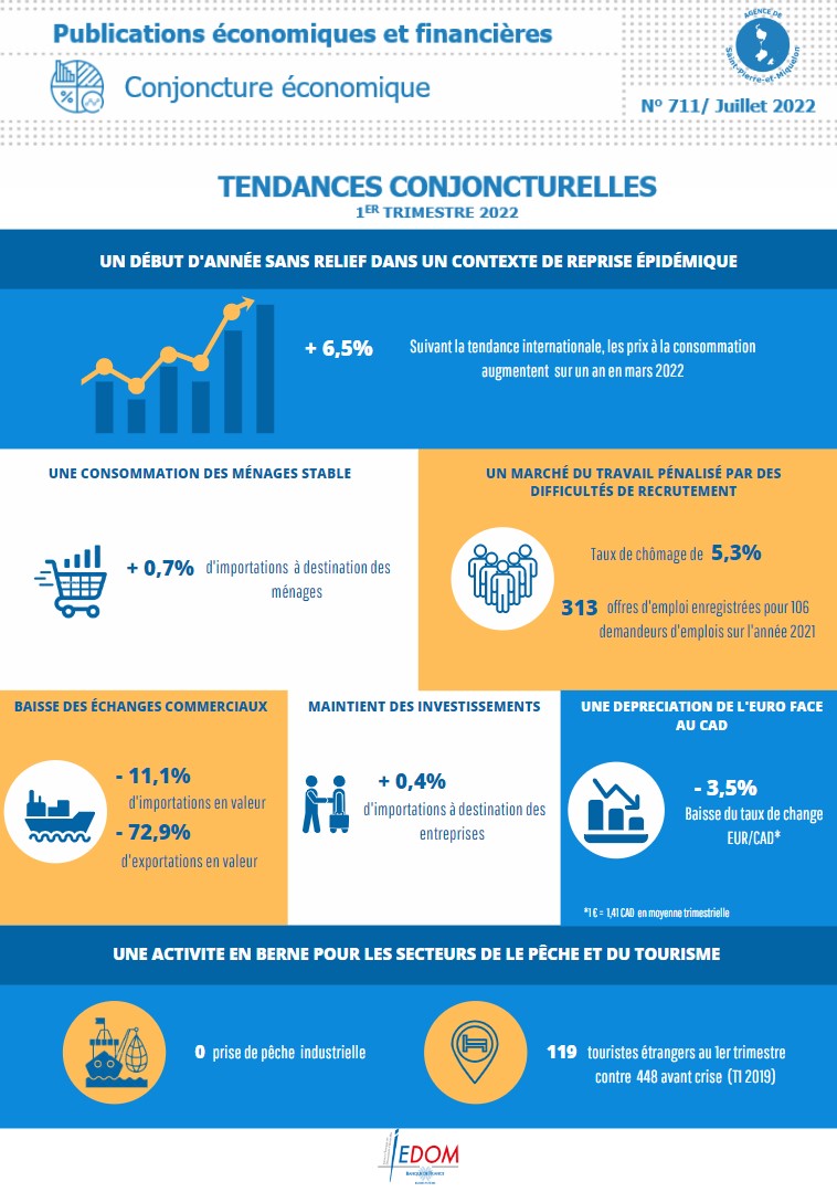 Suivant la tendance internationale, le début d’année est également marqué par la progression continue de l’indice des prix à la consommation en lien avec l’augmentation du prix du gaz, de l’électricité et des produits alimentaires à Saint-Pierre-et-Miquelon. Les indicateurs sur le marché du travail restent favorablement orientés. Toutefois, les entreprises sont confrontées à une pénurie de main d’œuvre, les limitant dans leurs activités. La consommation des ménages se stabilise, portée par la baisse des importations en valeur de biens non alimentaires tandis que les importations en valeur de biens durables et alimentaires augmentent sous l’effet de la hausse des prix. Après une croissance notable sur l’année 2021, l’investissement des entreprises se maintient au 1er trimestre 2022.